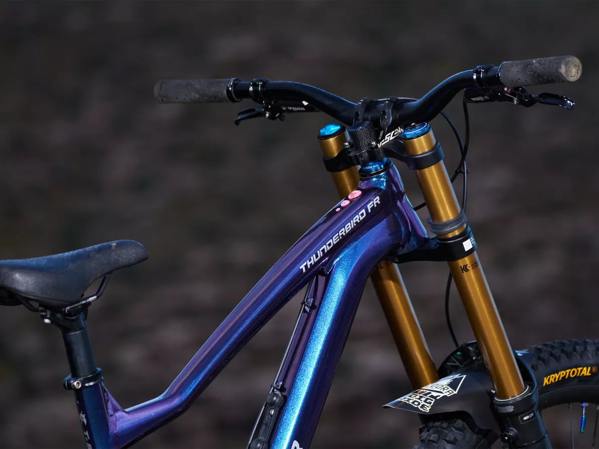 All-aluminum Thunderbird frames are designed to be compatible with the new generation of 1.8" tapered forks featuring 68–69mm crowns. Bigger means stronger — a crucial advantage in Superenduro and Freeride riding. Of course, these frames also work perfectly with standard tapered forks with 1.5" steerer tubes. And when you purchase our Storm or Storm Intro headsets, both crown races are included.