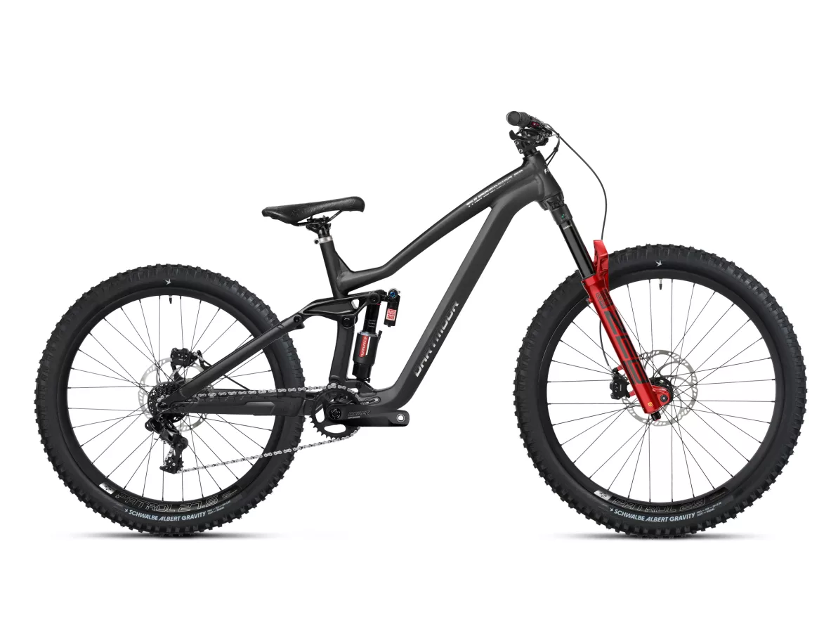 The SRAM GX DH 7-speed drivetrain with an 11–25T cassette keeps the gearing tight, clean, and ready for bike-park speed runs. Tough Patrol welded rims paired with Reel Expert hubs form a durable and reliable wheelset wrapped in Schwalbe Albert Gravity Pro radial-construction tires - the pinnacle of grip, traction, and precision control across any surface.