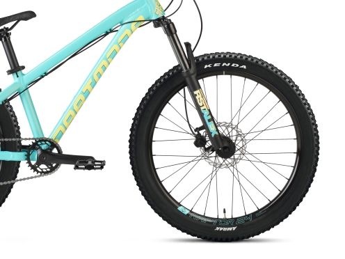 The soft-spring RST Alex fork adds comfort and control on small bumps, while the Microshift Acolyte 8-speed drivetrain with a wide-range 11–38T cassette makes climbing easier. Tektro hydraulic disc brakes bring reliable stopping power, keeping the ride safe and confident. With durable Dartmoor Raptor wheels paired with Kenda Amrak tires and a sturdy Dartmoor cockpit, the Hornet Junior is ready to roll - playful, capable, and full of trail spirit.