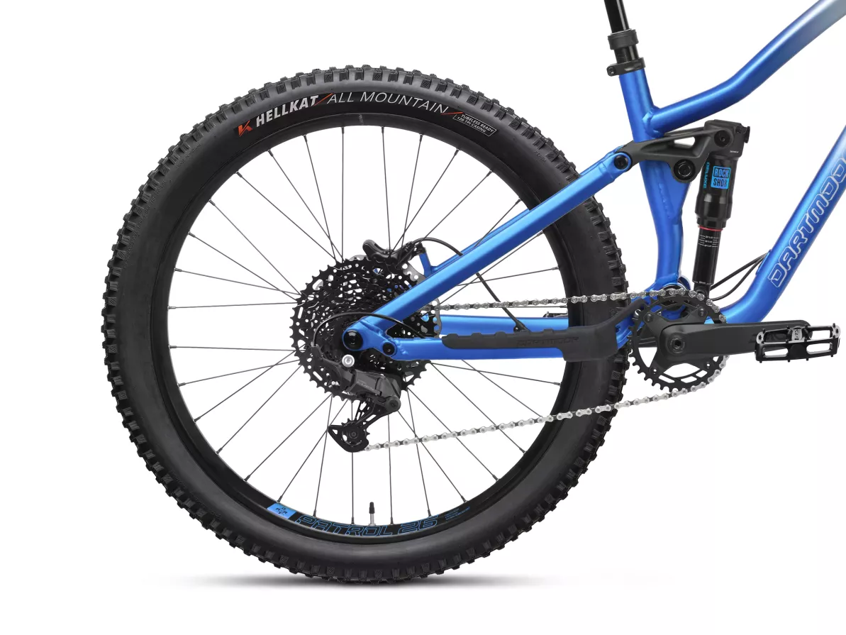 Strong Patrol welded rims, Kenda Hellkat 120 TPI All-Mountain tires, a Dartmoor Shorty stem, and an X-Fusion Manic LC dropper post complete a setup that’s light, tough, and ready for serious trail riding.