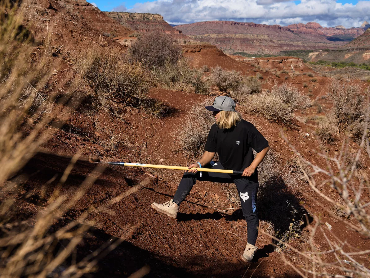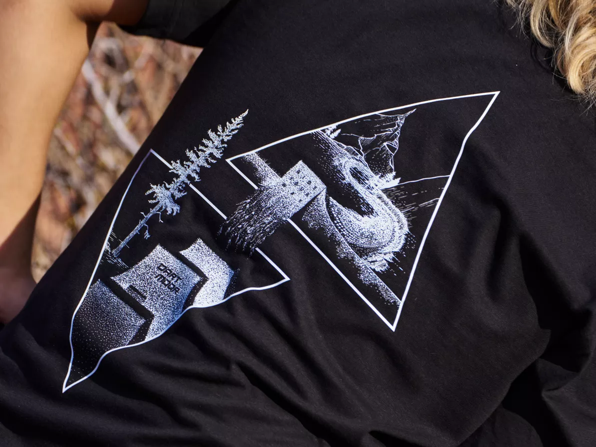 On the back, two massive triangles - the top one twists through the mountain trail, the bottom one is all about dirt jumps and airtime. Rock it, and watch people do a double-take.