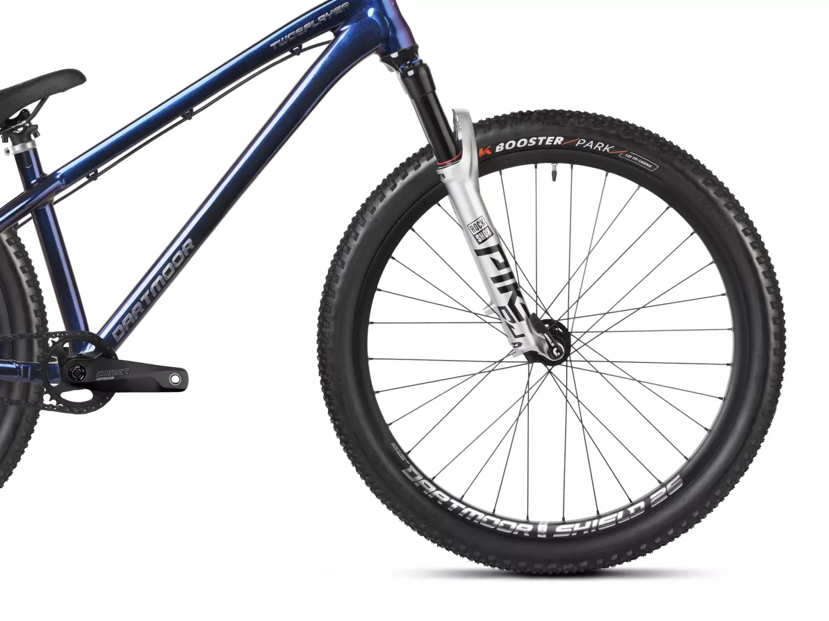 At its heart lies the legendary RockShox Pike DJ fork, delivering precise stiffness and control for the biggest hits and smoothest landings. Power is transferred through the FSA Comet Heavy Duty crankset with a 28T chainring. Short 155mm arms follow the trend our riders swear by, giving you more control, faster pedal catches, and a tighter feel in the air. The Dartmoor Shield rims combined with a Reel Pro Singlespeed rear hub and 120TPI Kenda Booster Park tires provide the perfect mix of durability, speed, and grip on both dirt and concrete.