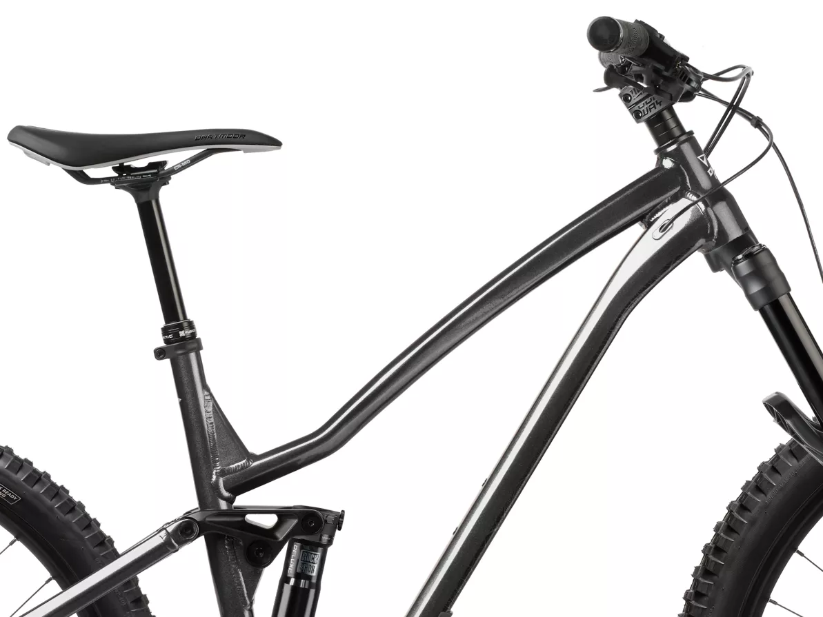 The wheel setup combines Raptor rims with folding Kenda Double Black K-Series tires featuring a 60 TPI casing, ensuring grip and durability in all conditions. A Manic LC dropper post from X-Fusion adds full trail versatility, letting you drop in or climb out at the touch of a lever.