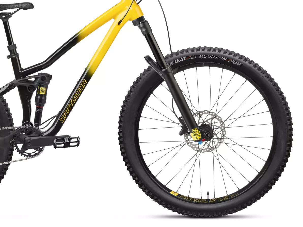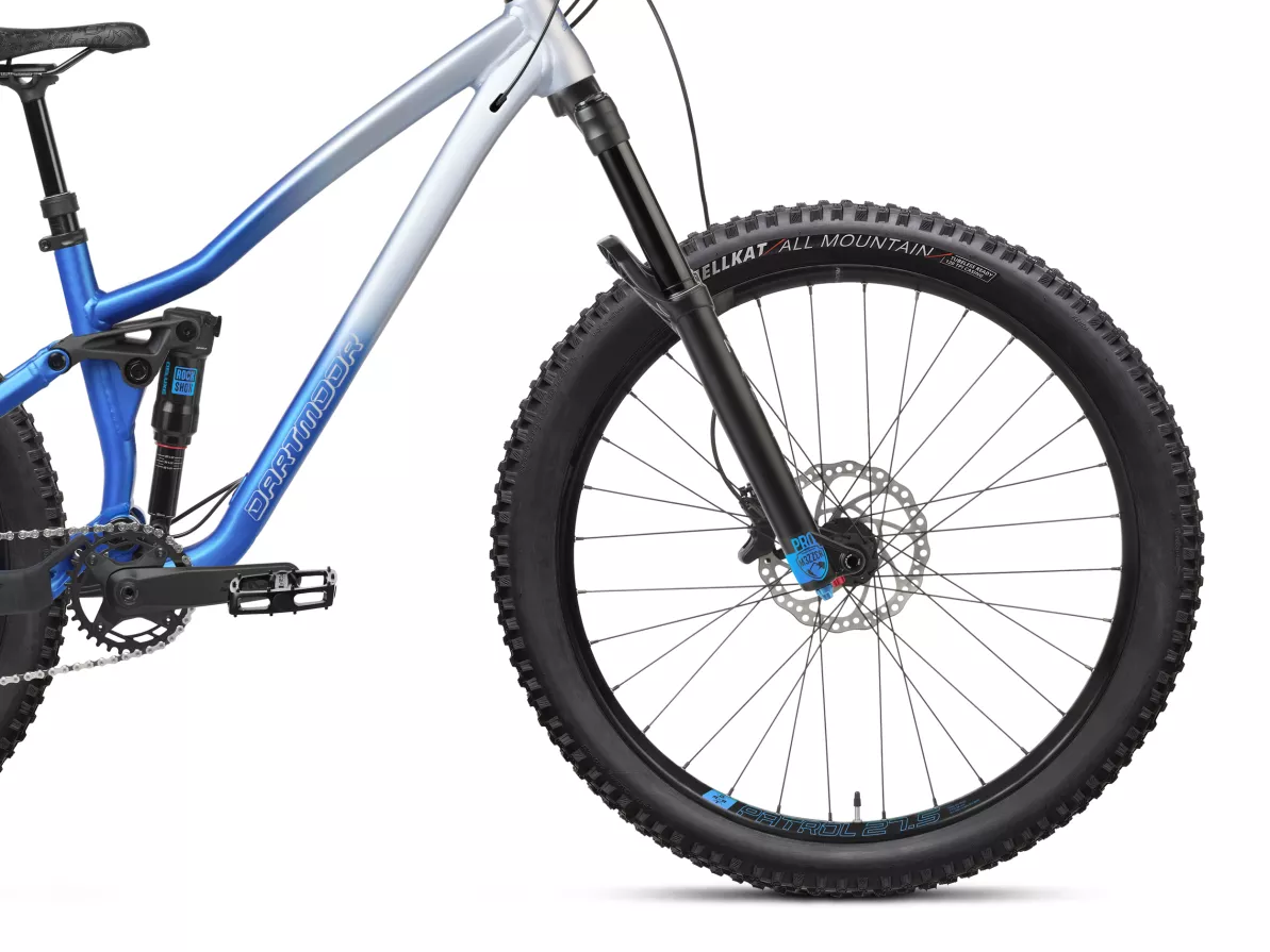 Strong Patrol welded rims, Kenda Hellkat 120 TPI All-Mountain tires, a Dartmoor Shorty stem, and an X-Fusion Manic LC dropper post complete a setup that’s light, tough, and ready for serious trail riding.